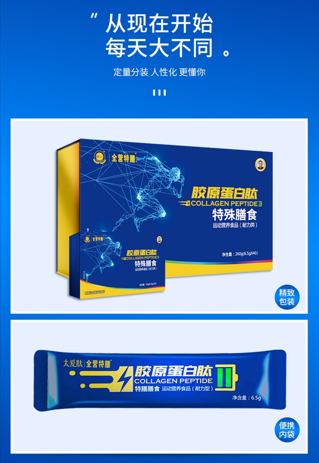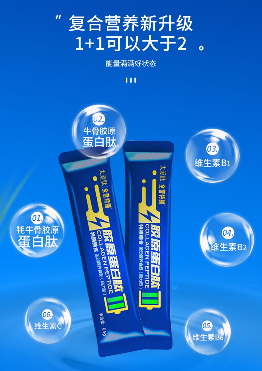 【简介】胶原蛋白肽精选牦牛骨胶原蛋白肽粉和牛骨胶原蛋白肽粉为主要原料,经国家专利技术提取,特别添加维生素B1、维生素B2、维生素B6、牛磺酸等综合营养,可被人体直接吸收利用。