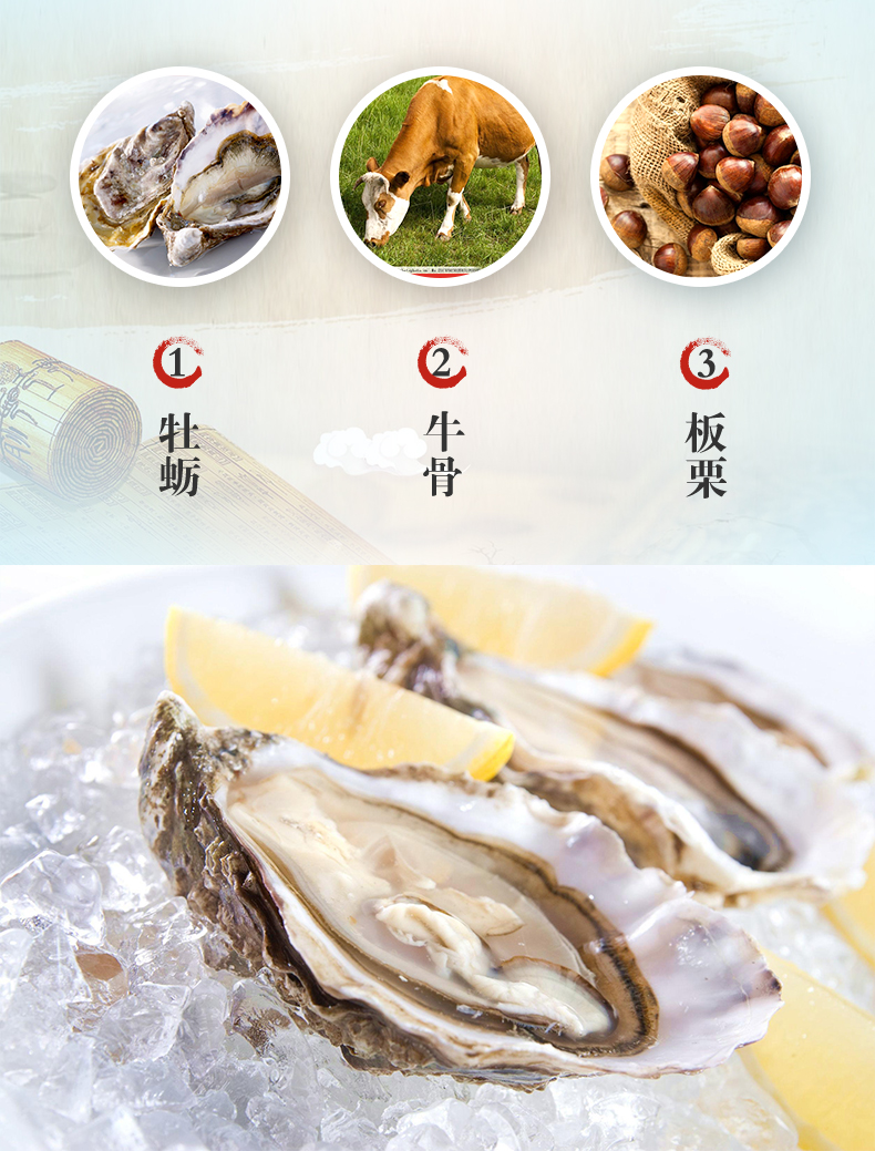 牡蛎素有“海中牛奶”之称,营养素丰富,矿物质锌的含量高达20-47毫克,居人类食物之冠。《神农本草经》有记载:牡蛎味咸、性微寒,归肝、胆、肾经,具有平肝潜阳、重镇安神、软坚散结、收敛固涩的功效。